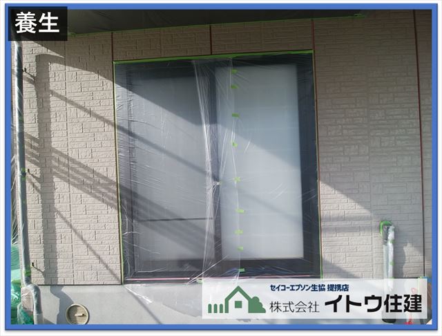 次に養生作業です。塗装しない窓や玄関ドア、給湯器、計器類、配管などをビニールなどで覆う作業です。特に窓の養生は塗装部分と非塗装部分の境になり、養生が曲がっているとその境も曲がってしまい見栄えが良くないので丁寧な仕事が要求されます。