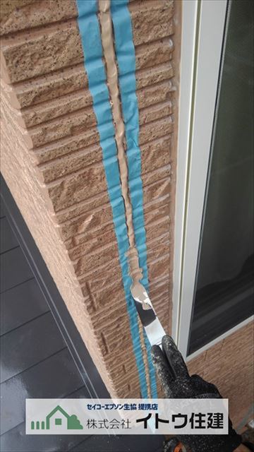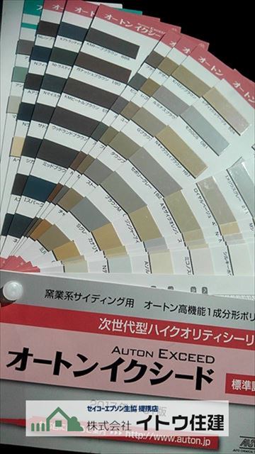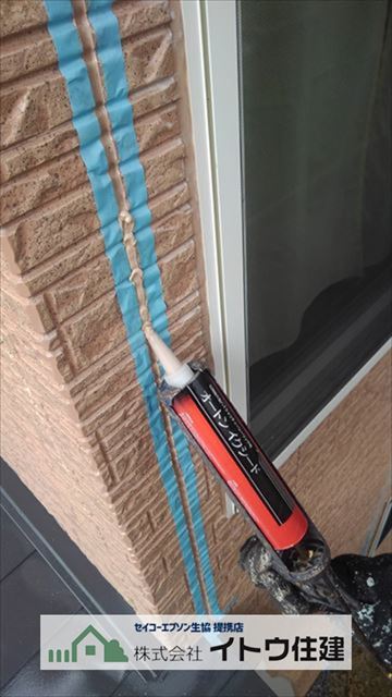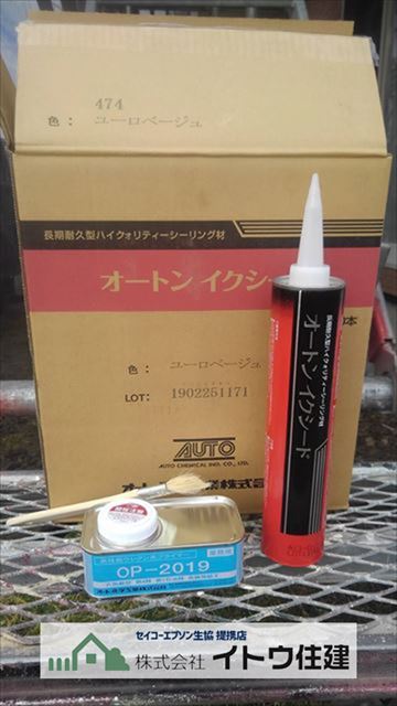 今回使用したシーリング材はオート化学工業株式会社のオートンイクシードです。弊社が標準使用しているシーリング材で、高耐久が期待できる材料です。シーリングの色も白や黒、茶だけではなく、100色以上の中からお選びいただけます。壁の色に合わせて目立たなく出来ます。今回はユーロベージュという色になりました