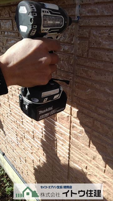 いよいよ作業が始まります。打ち替えなので古く劣化したシーリングを撤去します。今回はスリーエムジャパン株式会社のスピンカッターという道具を使って除去しました。通常はカッターを何度も入れて切り離すのですが、スピンカッターはインパクトドライバーの先になり、回転しながら切り離してくれます。作業時間が3倍ほど早くなります。カッターを使って除去するのは危険も伴います。その危険度も解消され、しかもきれいに切れ離せます。早い、安全、きれい、優れた道具です。