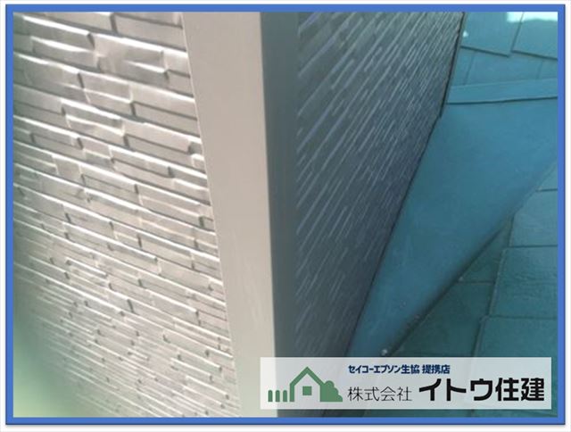 工事の様子です。まず金属サイディングを張るための下地を作っていきます。胴縁という樹脂製の角材をコーナーと各面の中央に打ち付けます。この胴縁に金属サイディングを止めます。レンガタイルが剥がれた部分には胴縁を小さく切ったものやスペーサーで高さ調整をしています。