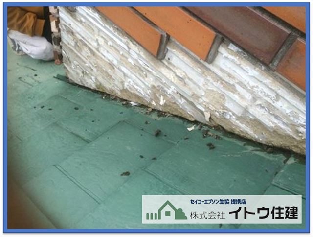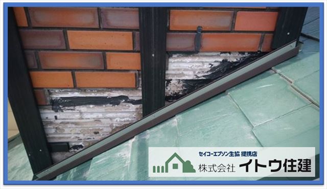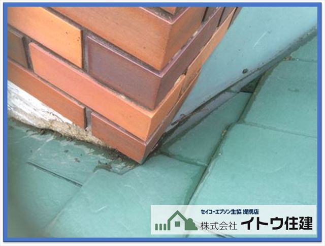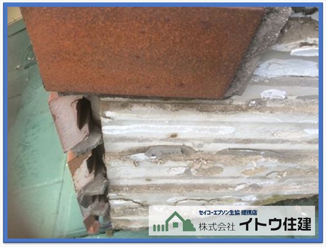 煙突上部にある谷という雨水の通り道が、煙突の角に来ています。水の処理をきちんとしていれば問題なかったのですが、レンガタイルが貼ってある下地にちょくせう水が来て、その処理がされていないため、下地がボロボロになっていました。セメント系の下地なのでこれではタイルの重みを支えることができません。その結果レンガタイルが剥がれ落ちてしまったのです。