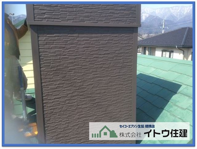 松本市補修工事|レンガタイルが剥がれた煙突に金属サイディングを重ね張り