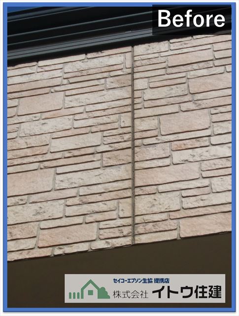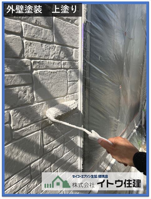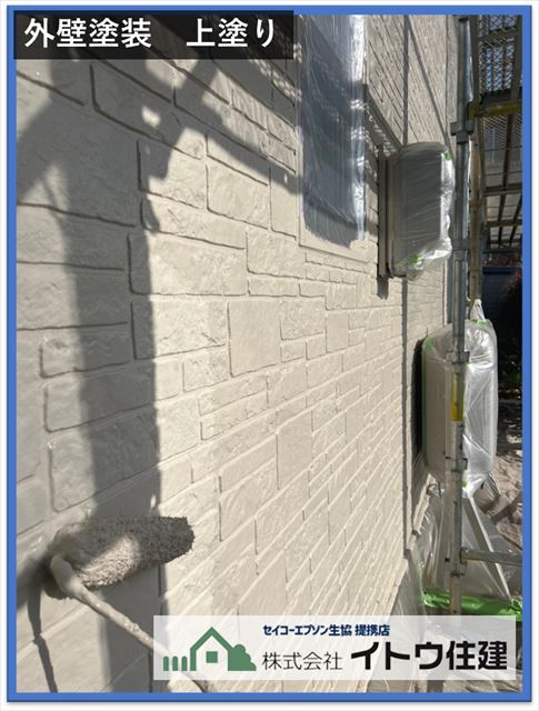 最後に上塗りの工程です。ご覧のように石積み調のボード自体のデザインは残りますが、単色述べた塗りになっています。ただ今までの重厚感がある色から明るい白系の色になって軽やかな外壁になったと思います。凹凸がある外壁なので塗り残しがないように仕上げるのがポイントです。お悩みだったシーリングの劣化もすべて打ち替えることによって心配なくなりました。シーリングの上から塗装しているので長持ちもします。