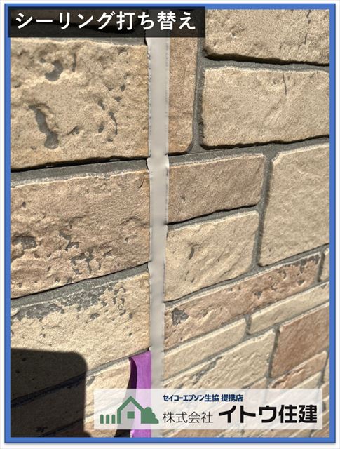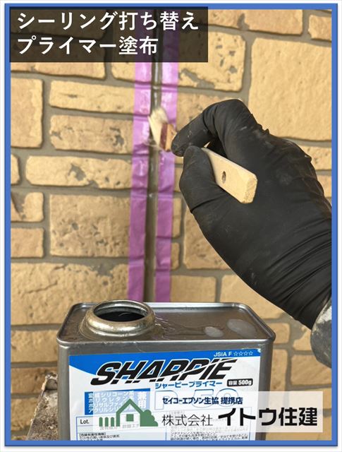 工事の様子です。まずはシーリングの打ち替えから行います。古いシーリングの両サイドをカッターできると簡単にはがすことができます。細かい残ったシーリングもきれいに剥がして裸になった目地の両サイドにはみ出し防止のマスキングテープを貼ります。簡単に貼るといいましたが外壁の凹凸に合わせて不陸がないように貼らなければいけないのでそこそこ技術のいる作業です。そのあと目地に下塗りのプライマーを塗布います。外壁面とシーリングに密着を高めるための塗料です。