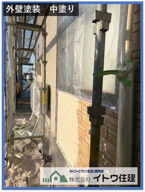 外壁塗装の様子です。外壁も屋根同様下塗り、中塗り、上塗りの3回塗りで仕上げます。下塗りには窯業系サイディングに染み込ませて中からサイディングボードを強化する浸透性プライマーを使いました。サイディングボードの強化とともに徒労の密着を高める効果もあります。