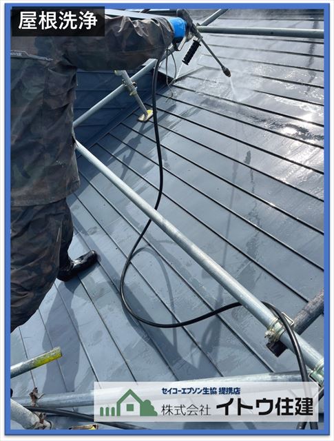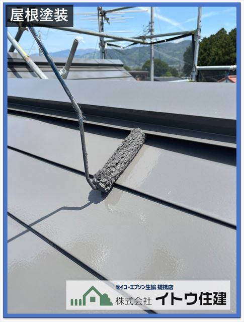 屋根塗装の様子です。屋根塗装は下塗り、中塗り、上塗りの3回塗りで仕上げるのが一般的です。まずは最初の工程の下塗りです。使用した塗料はAGCコーテックの防錆プライマーです。サビ止め効果とともに塗装面と塗料の密着を高めるための塗装です。白い下塗り材を使ったのでいったん屋根は真っ白になります。
