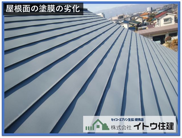 塗装前の屋根の状況です。サビなど目立ったダメージはありませんでしたが、たぶん黒系の屋根色だったのがだいぶ変色して白に近いグレーになっています。塗料の色は顔料という色の成分を何色も組み合わせて作っています。顔料にも重さがあって白に近いほど軽く、黒に近いほど重くなります。塗膜が劣化していく過程で、重い黒系の顔料は下へ、軽い白系の顔料は上へと分離していきます。塗料のどんな色でも変色は白っぽくなったり薄くなったり、明るくなったりします。白に近い明るめの色が上へと分離しているためです。屋根の場合はこの白っぽく変色していく現象が塗装時期のサインです。
