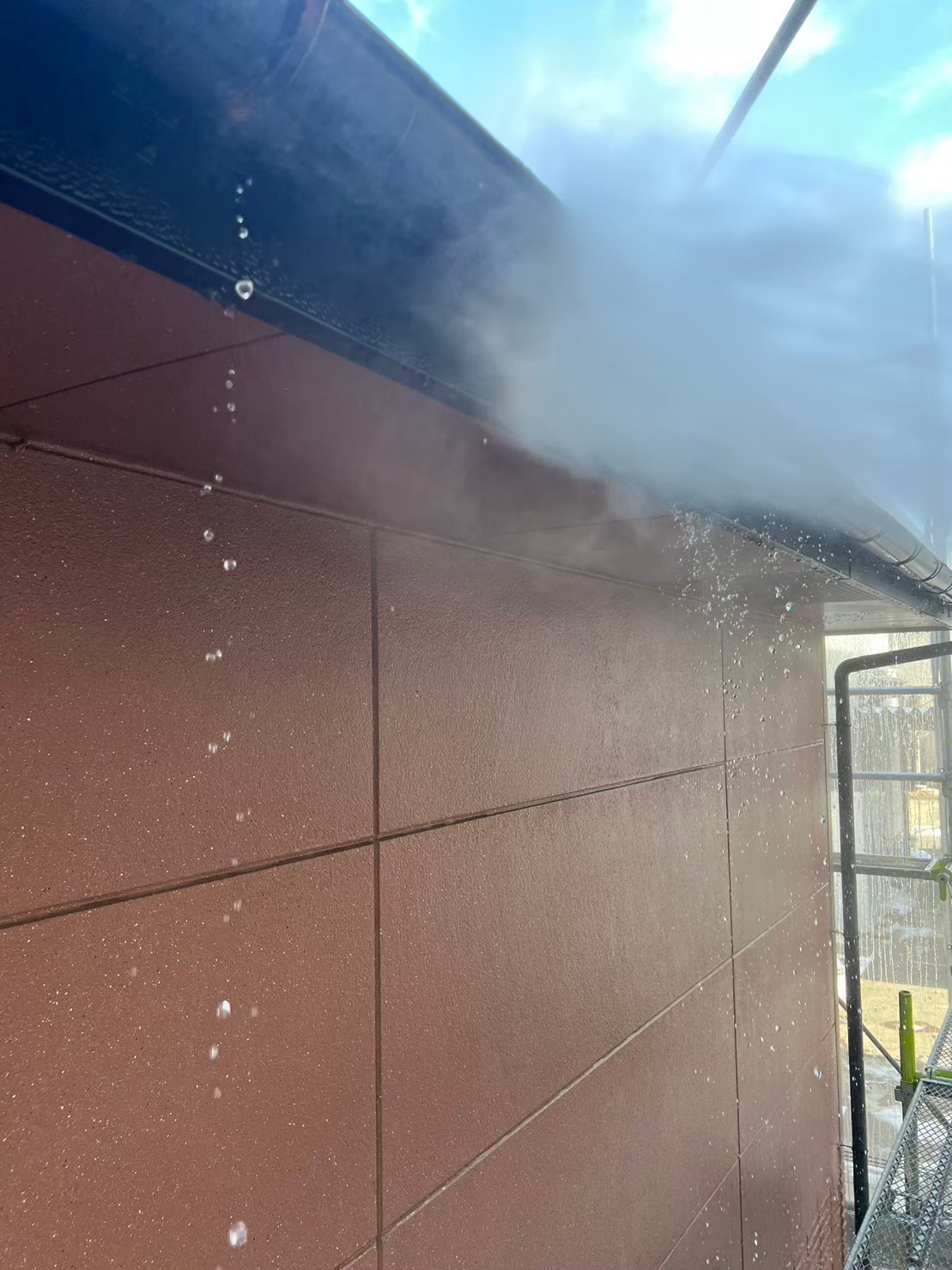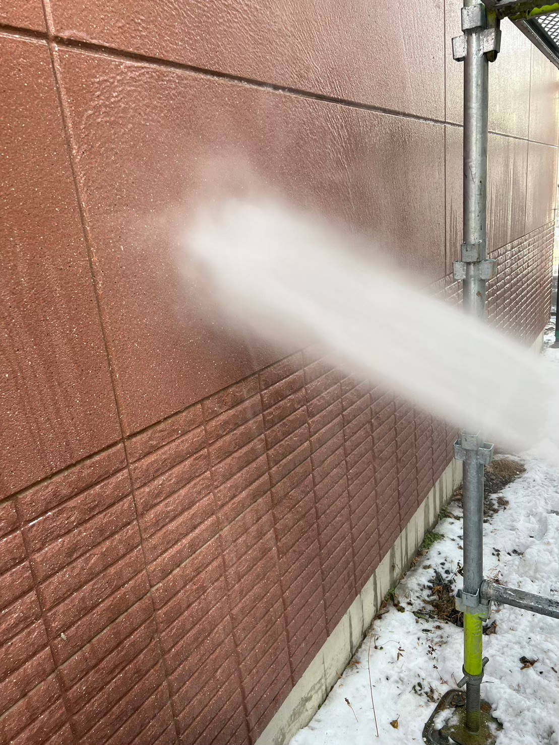 洗浄作業の様子です。冬に施工致しました。今冬の気温は高めでしたので、作業もしやすかったです。気温が氷点下になりますと北面を高圧洗浄で洗っているうちにみるみるシャーベットになる時も御座います。そういった場合は改めて洗うか、ケレン(研磨)で処理を致します。外壁の塗料は水性なので、そういった日には塗装が出来ませんので気温を見計らっての施工となります。