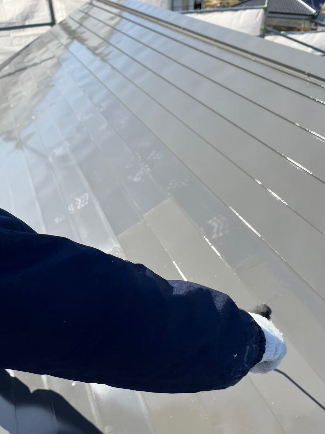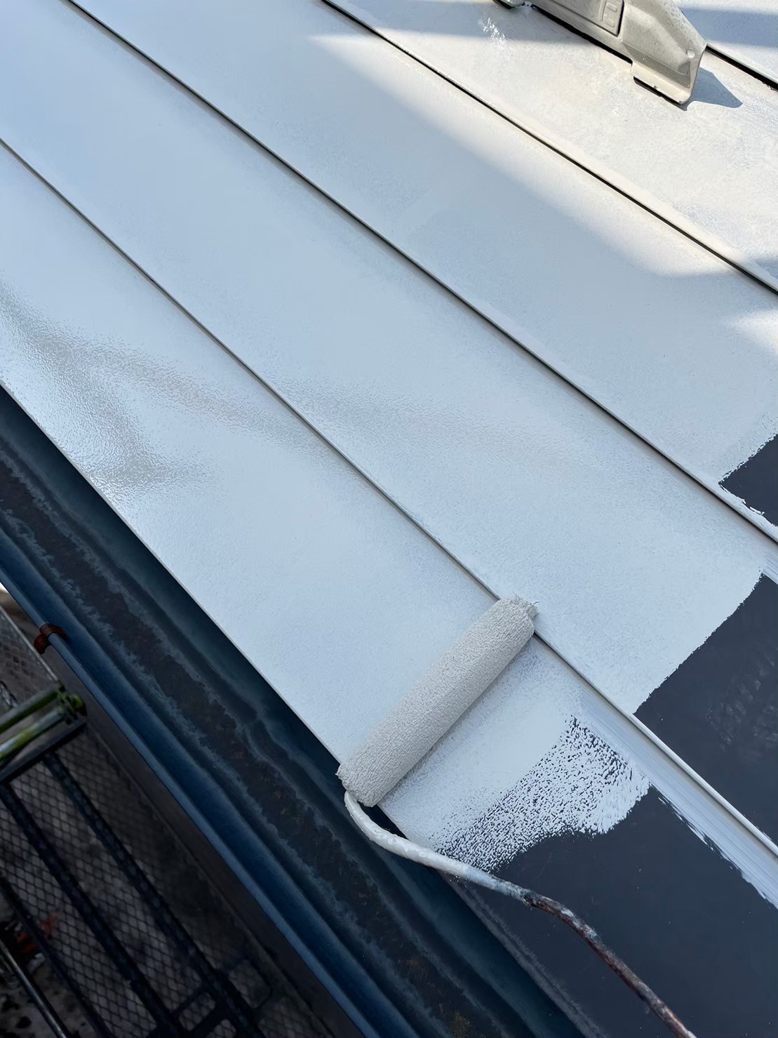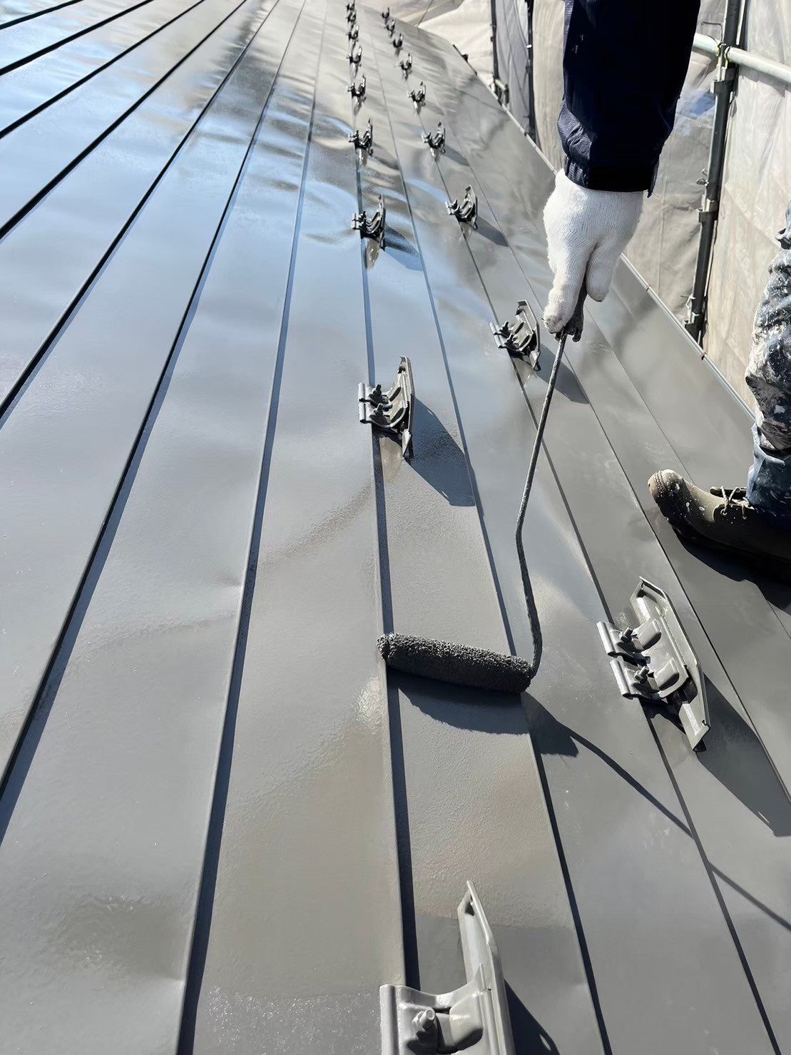 屋根塗装の下塗りの様子です。錆止めプライマーを下塗り致します。