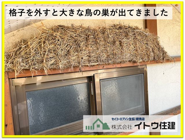 面格子を外すと想像以上に大きな鳥の巣が出てきました。窓の幅いっぱいにありました。弊社の事務所の入り口にもツバメが巣を作っていますが、下場に支えが何もなく壁にくっついているだけで落ちない鳥たちの建築技術は感心しますが、フンの被害や今は病原の心配もあります。できれば家には巣を作らないでほしいのですが・・・