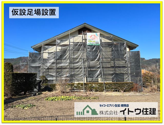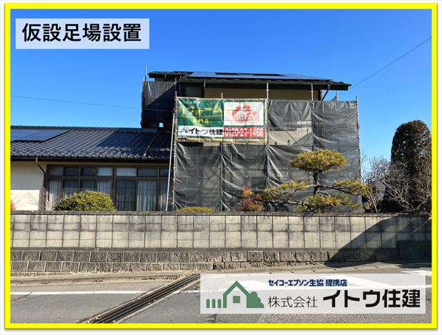 工事の様子です。まず仮設足場を設置します。