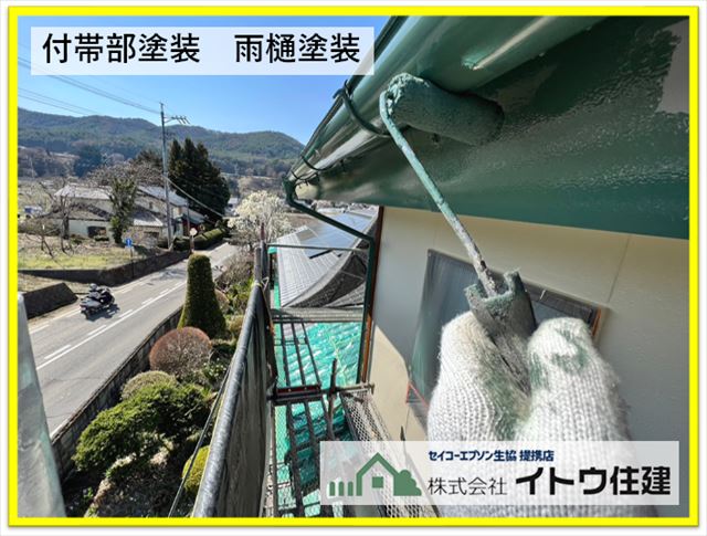 ◆雨樋と鼻隠しを塗装します。鼻隠しとは雨樋がついている面を言います。どちらも金属製なので破風と同じ金属屋根用の塗料を塗装しています