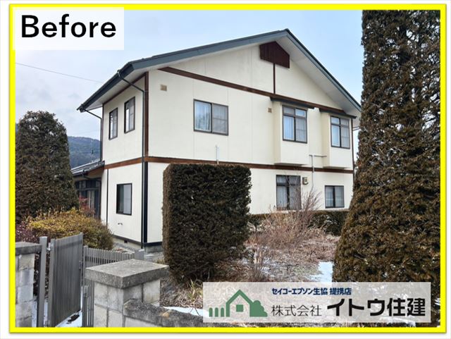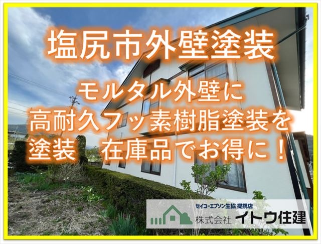 塩尻市外壁塗装|モルタル外壁に高耐久フッ素樹脂塗料を塗装|在庫品でお得に!