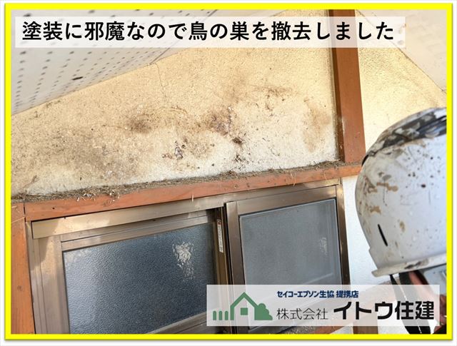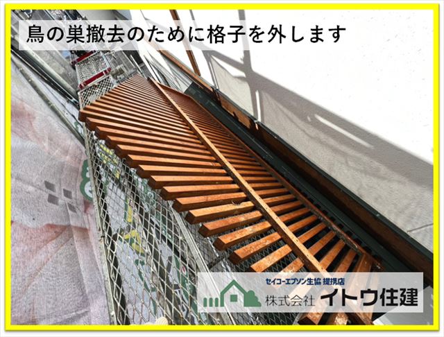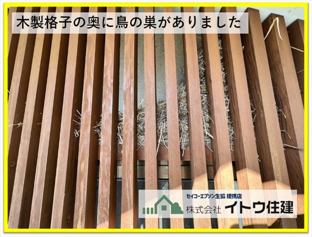 お客様のお悩みの一つに木製の面格子の奥に鳥の巣があり、撤去したいが手が届かなくて撤去できないでいるというものがありました。見てみると確かに面格子の奥にわらなどでできた大きな鳥の巣がありました。塗装工事をするうえでも邪魔なものなので、面格子を外して撤去します。