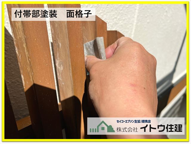◆外壁をぐるっと囲む帯のような幕板の塗装です。木製なので面格子と同じキシラデコールを塗装しています