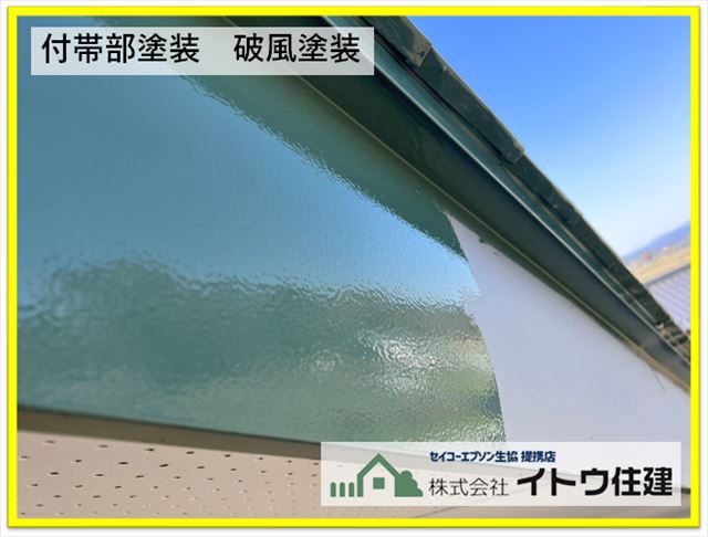 ◆切妻屋根(三角屋根)の斜めになる屋根の側面を破風(はふ)と言います。ここは高所になり、屋根の上からは塗装でいないので足場のかかっている今一緒に塗装します。金属製なので金属屋根用の塗料を塗装しています。
