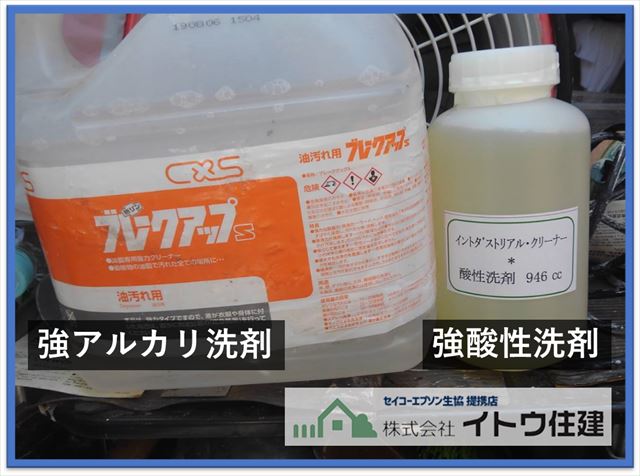 次に洗浄作業です。まずは強アルカリ洗剤ブレークアップで洗浄し、アルカリ性になった表面を今度は強酸性洗剤インダストリアルクリーナーで洗浄することで中和させます。