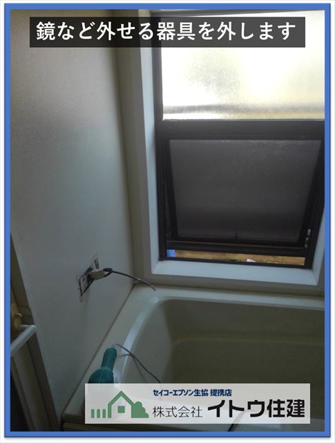 まずは鏡や小物置きの棚など外せる器具はすべて外します。鏡は塗装できませんが外した器具も必要に応じて別の場所で同じように塗装することができます。
