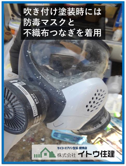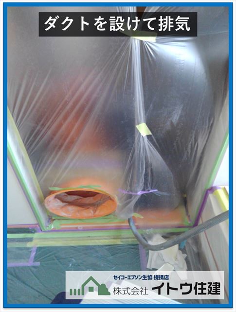 塗装は吹き付け塗装で行います。屋根や外壁の塗装のように外で行う吹き付け塗装なら必要ないのですが、密閉したユニットバスの浴室なので作業者の安全のため防毒マスクを着用し、ダクトを付けて排気設備を設けます。
