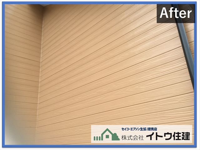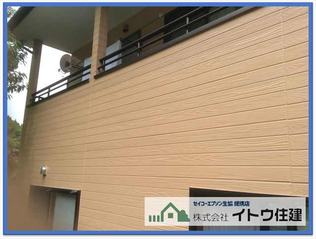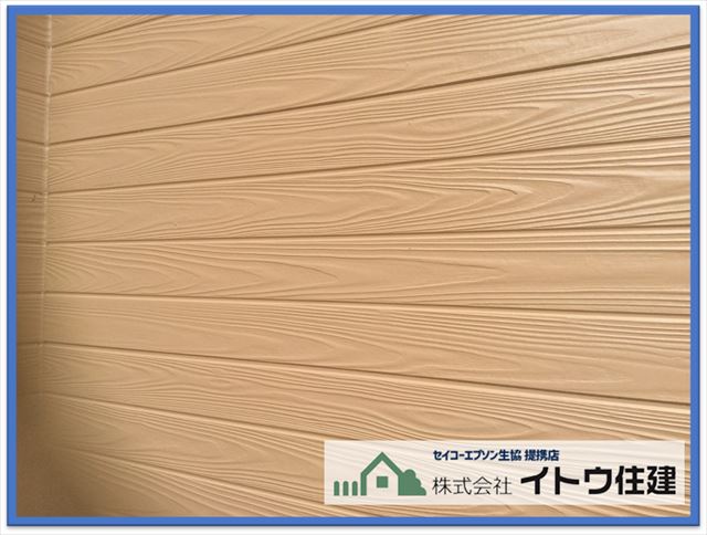 吹き付け塗装後の外壁です。今までの木目調の柄は消えることなく、塗料の性能も不足なくギリギリの塗膜ができました