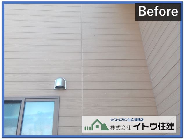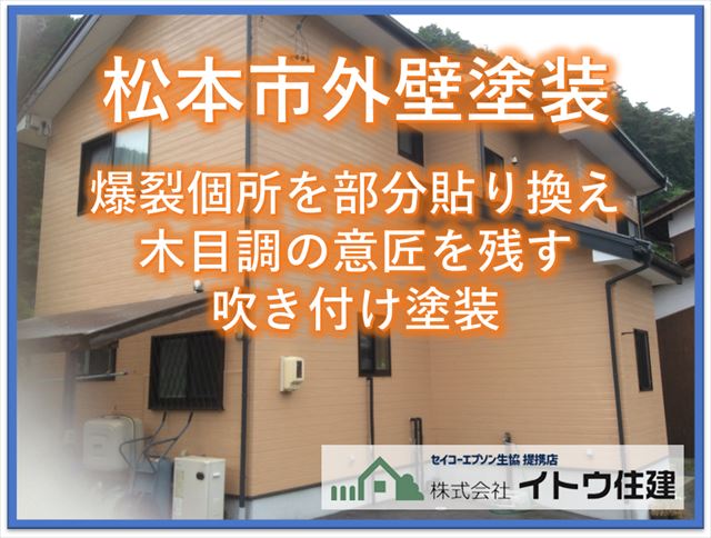 松本市外壁塗装|爆裂個所を部分貼り換え|木目調の意匠を残す吹き付け塗装