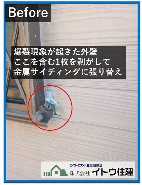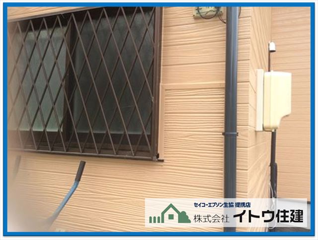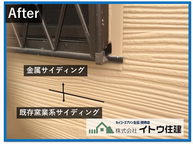 右の写真はサッシの右側、隣のボードとのジョイント部分に見切り材を入れなければならなかったので、額縁のように見えてしまいます。これがなければ全くわからない仕上がりだったのですが、灯油タンクの真上なので仕方なしということになりました。ただ今までボロボロだった外壁が見違えるようにきれいになりお施主様も喜んでおられました。