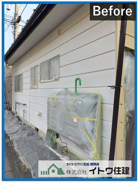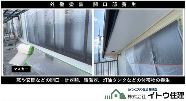 屋根と同時に洗浄は行ったので、養生の作業からです。窓や玄関などの開口部や給湯器、計器類、給排水の配管などの付帯物、犬走などの地面で塗装をしない箇所、塗料が付いてはいけない部分は、マスカーというビニールにガムテープが付いた材料やブルーシート、メッシュシートなどを使い覆います。これを養生といいます。特に窓周りは塗るところと塗らないところが隣り合わせになるので、曲がった養生をすると仕上がりのラインがそのまま曲がってしまいます。養生の出来の良し悪しで塗装の仕上がりが決まるといっても過言ではありません。神経と技術を使う作業です。