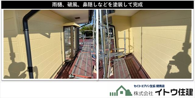 最後に破風(はふ)、鼻隠し(はなかくし)、雨樋を塗装して完成です。屋根、外壁を同時に塗装すると、養生をしたところ、基礎のコンクリート部分を除いてすべてを塗装することになります。