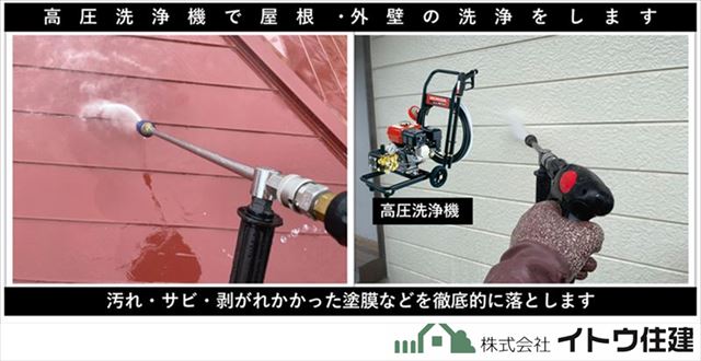 足場を立てた後、屋根、外壁ともに洗浄をします。砂ぼこりなどの汚れはもちろん、剥がれかかった塗膜、外壁のチョーキングの粉、塗装面の水で落とせる異物はすべて洗い流します。洗浄機は家電量販店やホームセンターで打っているようなものではなく、値段も10倍するようなガソリンエンジンの強力な洗浄機を使います。