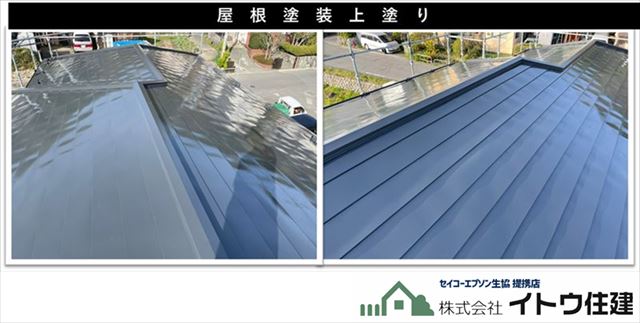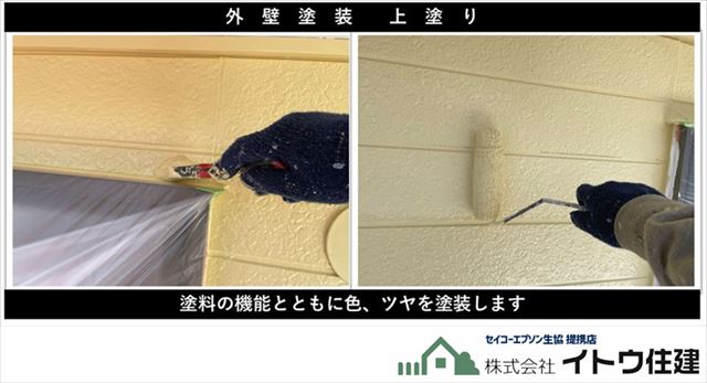 次に上塗りの工程です。塗料の機能プラス色つやを塗る工程なのは屋根と同じです。