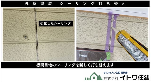 窯業系サイディングのほとんどはボードとボードの接続部分に目地ができ、その目地の防水にシーリングという固まるとゴム状になる充填剤が打たれています。紫外線や風雨、ケイナンで劣化するので打ち替えなどのメンテナンスが必要です。