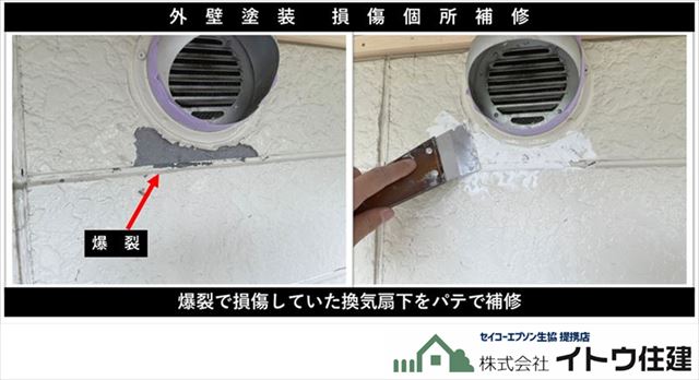こちらは爆裂してしまった換気扇下をパテで補修しているところです。