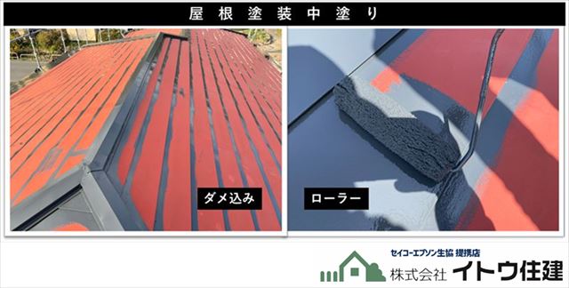 下塗り同様細かくて狭いところはダメ込み、広い面はローラーを使います。左の画像の黒く見えるところがダメ込みをした中塗りの塗料、右の画像はローラーで広いところを塗っている様子です。