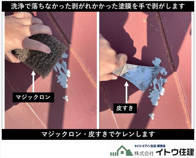 洗浄で落としきれなかった、剥がれかかった脆弱な塗膜やサビをケレンという作業で落とします。