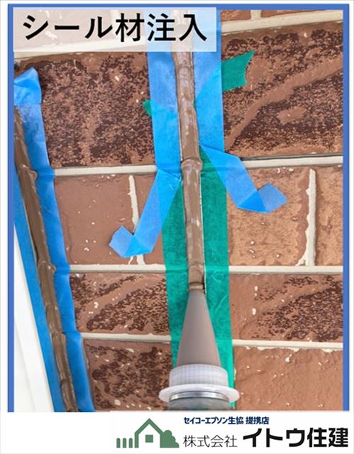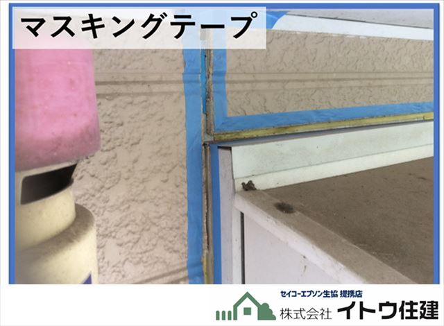 シーリングの撤去のあとは目地の両サイドにマスキングテープを貼ります。これは余計なところにシーリングがはみ出さないように、きれいなラインで仕上がるように貼るテープです。たまにシーリングの打ち替えをご自分でやられる方がいらっしゃいますが、ほとんどの場合このマスキングテープを貼らずにはみ出したり、ガタガタな見た目の仕上がりになってしまいます。マスキングテープはプロの知識と技術です。