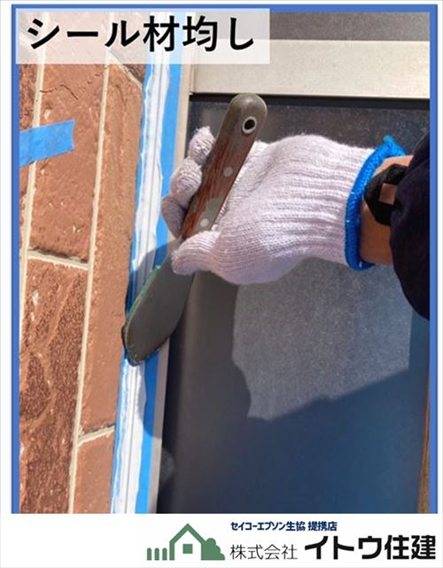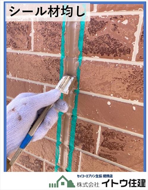 シーリングを専用のガンで押し出しながら充填していきます。マスキングテープがあるのではみ出すことはありません。重いっ切ってたっぷり押し出します。充填量が足りないと薄いシーリングになってしまいすぐに剥がれたりひび割れたりしてしまいます。充填したらすぐにヘラなどで均します。硬化が始まってしまうとうまく均すことができません。スピードが求められる作業です。鳴らし終わったらマスキングテープをすぐに剥がします。これも効果が始まってから剥がそうとするとテープがシーリングを引っ張ってきてしまいます。目地1本単位で充填、均し、テープはがしを一気に行います。