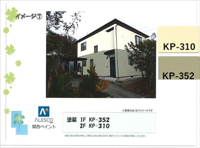 塗装2番目のプランです。2階は同じKP-310で1階はKP-352、若草色です。グリーン系の色をもってきました。周囲を山や木々に囲まれている立地なので、このグリーン系の色がなじみます。