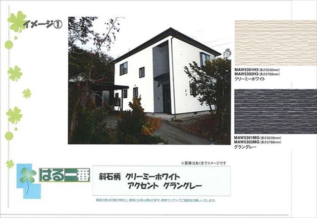 まずは最初のプラン、斜石柄のベースはクリーミーホワイト、少し黄色みがかかったホワイトです。玄関廻りにグラングレーという黒に近いグレーをアクセントに入れました。