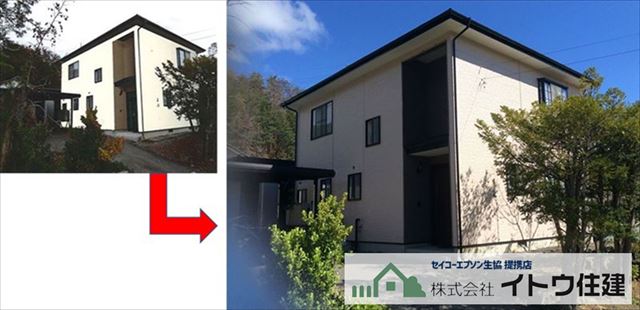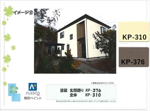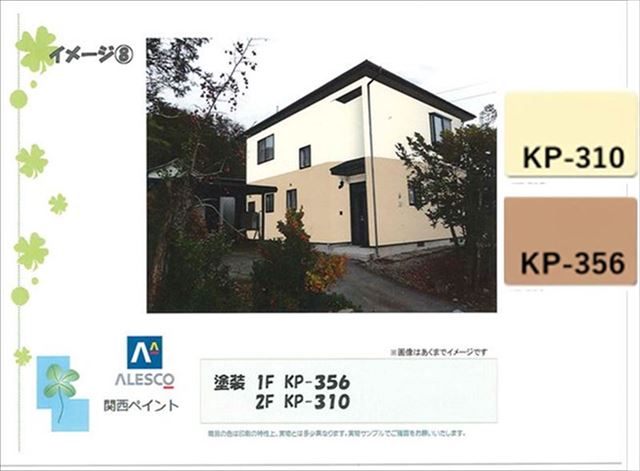 サイディングの時にご提案していた、玄関廻りの色を分けてアクセントカラーにするプランが気になっていたようで、塗装でもそのイメージが見たいということで、ほとんど決まっていたKP-376をアクセントカラーにして、ベースをKP-310にしました。このイメージ画像がお施主様にはヒットしたようです。塗り分けのプランはこのイメージで決まりました。