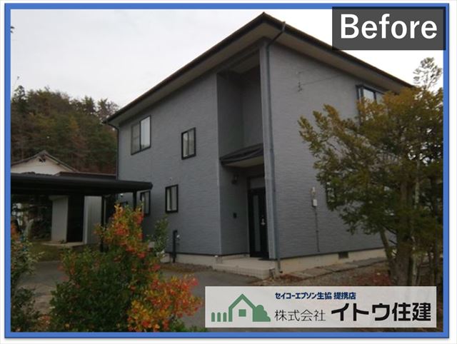 建物は窯業系サイディング※(ようぎょうけいサイディング)の外壁で、玄関が少し中に入っていますがほぼ長方形のお宅です。サイディング板間の目地のシーリングの劣化や損傷、サイディングボードの反り、色あせ、変色などの症状が見られました。劣化症状から最初は金属サイディングを重ね張りする方法を提案していましたが、最終的に塗り替えることになりました。塗り替えるにはボードの反りを直さなければなりません。ここでは目地カバー工法を採用して反りを抑えました。工事の詳細は別のブログでご紹介します。