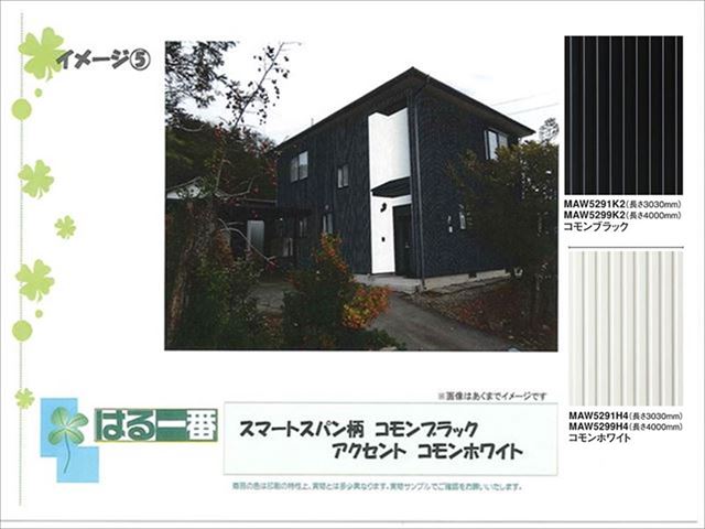 金属サイディングの最後のイメージ画像です。これまでと柄を替えてスマートスパン、縦張りのスパン柄です。私はこのプランが一番好きなのですが、すっきりとしたスパン柄ですが黒なので重厚感があります。そこにアクセントカラーのホワイトを入れて重くなりすぎないデザインだと思います。