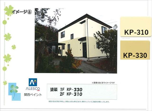 最初のプランは1階、2階で色分けをして、1階は関西ペイントのKP-330萌黄色という少し濃い目の黄色です。2階はほとんど白に近い少し黄色が入ったホワイトです。