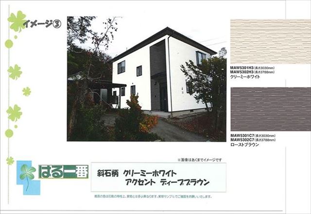 同じく1階2階を塗り分けるパターンで、茶系の色を1階に持ってきました。お施主様はこのプランが一番お気に召したようです。これで色が決まり、工事の段取りをしようとしたいたところ・・・