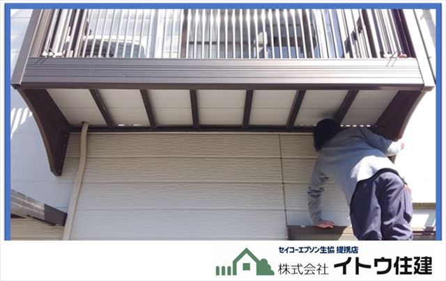 安曇野市屋根塗装・外壁カバー工事|アルミベランダの接続部からの雨漏り