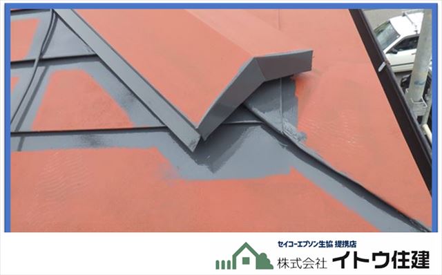 まずは下塗り(サビ止め)作業から。屋根塗装において下塗り(サビ止め)はかなり重要な作業となります。洗浄と下塗りがしっかりできていて初めて塗料の効果・耐久年数を発揮できます。