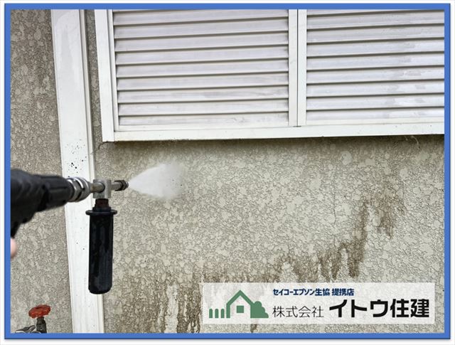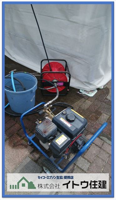 高圧洗浄をかけます。洗浄機はホームセンターや家電量販店などで市販されている電動の洗浄機では水圧が足りず、ホースを絞って水を細くする必要があります。ボールペンで紙を塗りつぶすイメージです。塗りムラができると想像できると思います。私たちプロは洗浄にはガソリンエンジン式の高圧洗浄機を使用します。ホースを絞らなくても必要な水圧が確保できます。筆で紙を塗りつぶすイメージです。塗りムラなく塗ることができると思います。