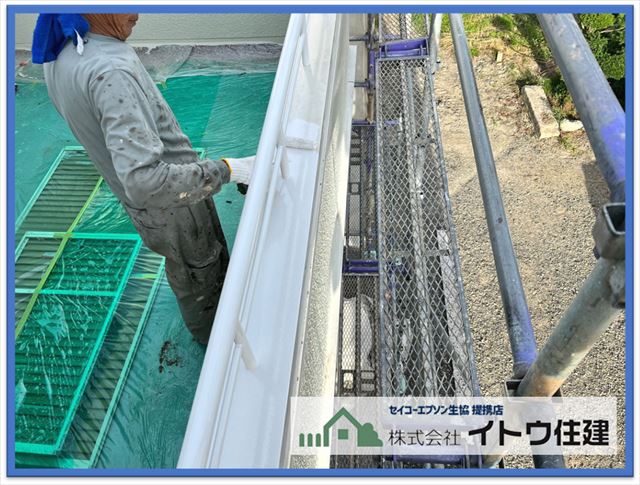 上塗りをして外壁塗装は終了です。上塗りをすることで塗料の持つ機能を高めるとともに、色つやを維持させることができます。