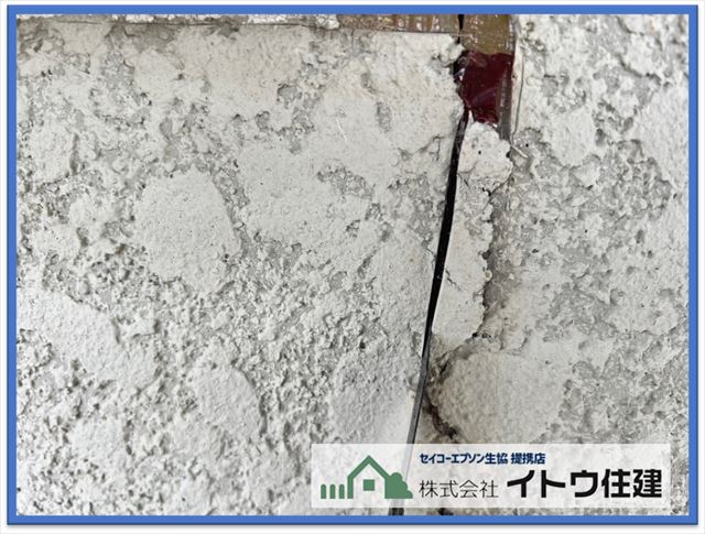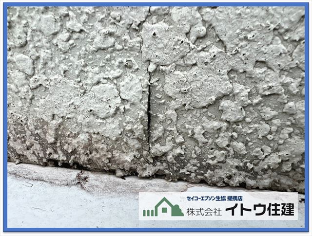 塗装前の外壁の様子です。凍害による爆裂だと思います。ほかにもモルタル外壁にはつきもののクラックも入っていました。塗装作業に入る前に補修をする必要があります。