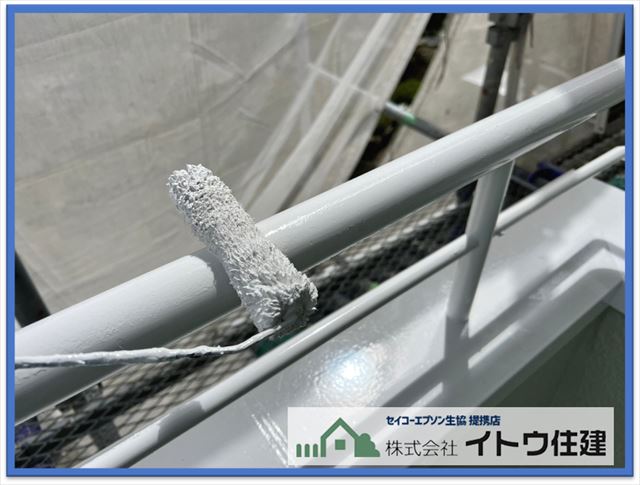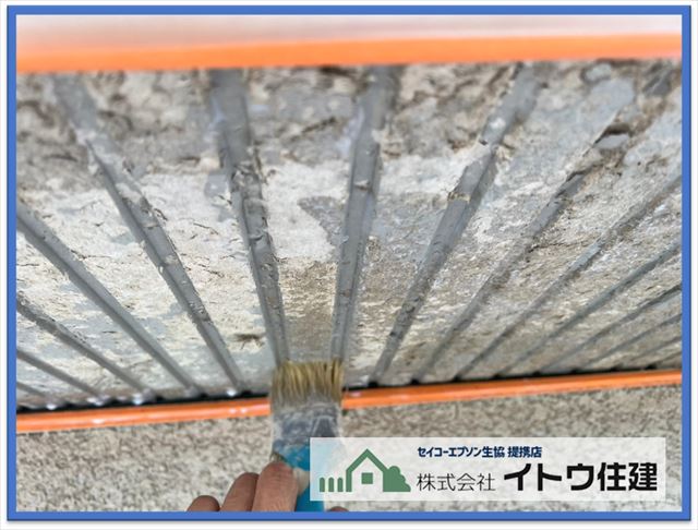 ベランダの手すりや笠木部分も若干サビが出ていたので塗装しました。ベランダ手すりはアルミなので通常の塗装では剥がれてしまいます。下塗りにミッチャクロンという下塗り材を使うと、アルミにも塗装ができます。塗装が難しい曽合でも塗装ができる下塗り材なのでよく使っています。