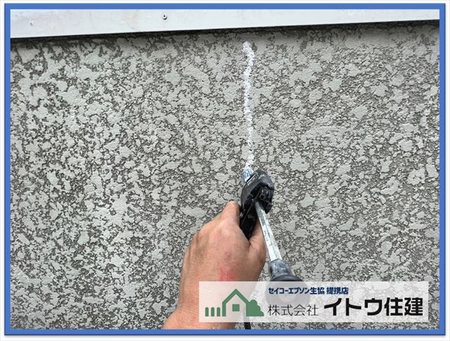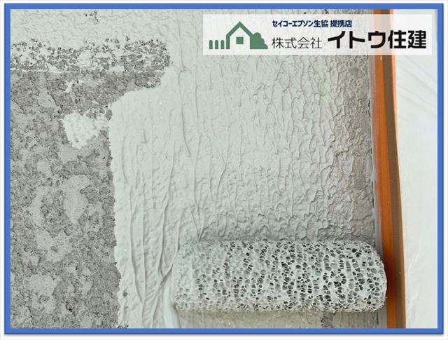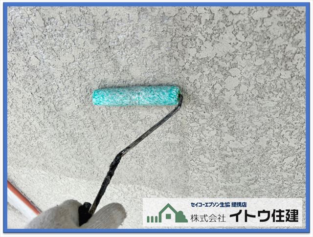 2回目の下塗り材はサーフェーサーというわずかに弾性がある塗料です。柔軟性があるのでモルタルの動きに追従してクラックの発生を防ぎます。同時に塗装面と塗料の密着を高める役割もあります。何事も下地が大切です。外壁塗装も一般的の工法にこだわることなく、外壁の状態に応じた最適な工法をとるのが私たちです。